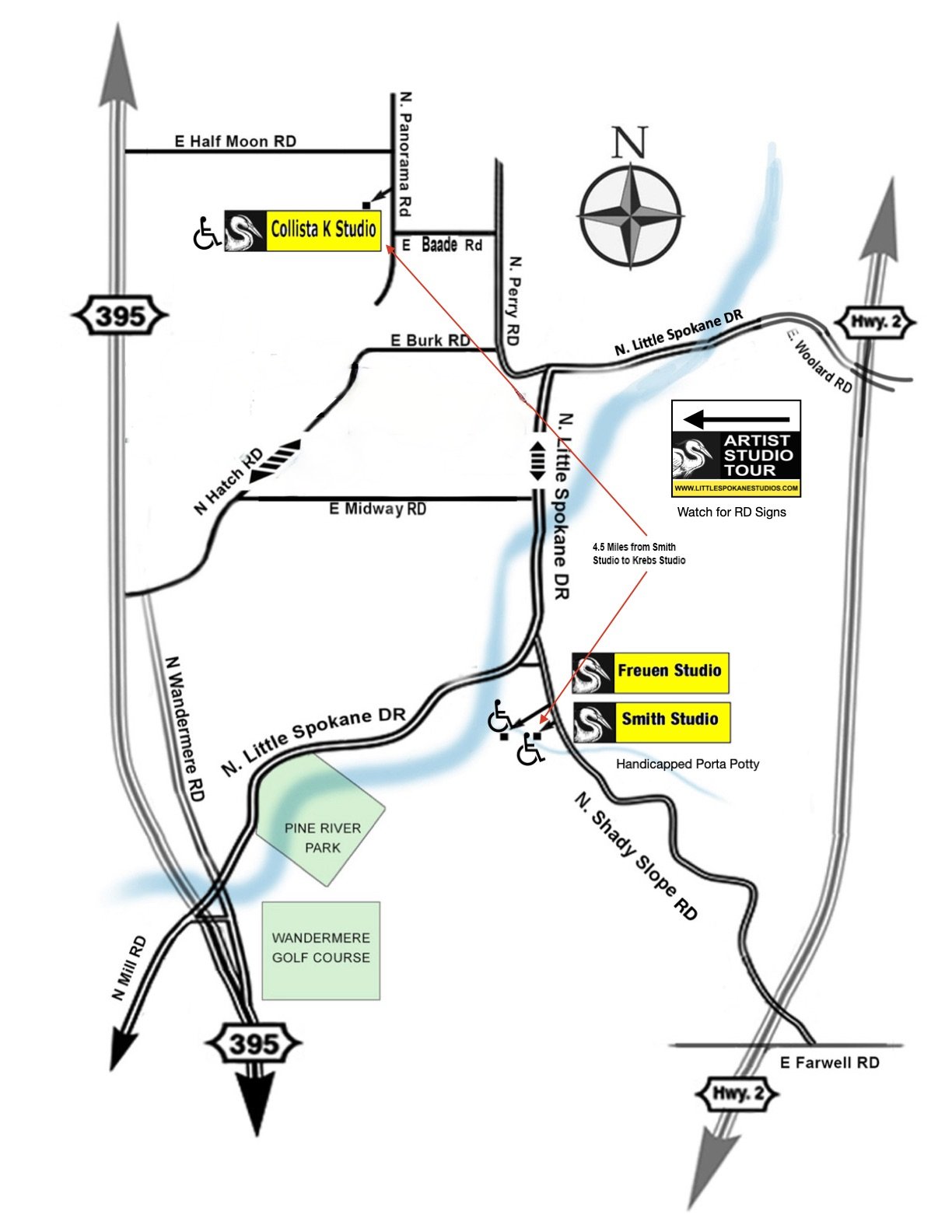 Just North of the Wandermere Shopping Center take the Wandermere RD Exit. Continue just past the golf course, turn left onto Dartford Drive and right onto N. Little Spokane Drive. Follow the tour signs to Freuen & Smith Studios.